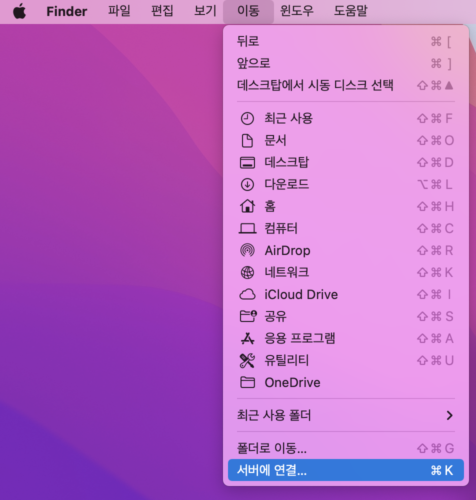 Mac > finder(탐색기) > 이동 > 서버에 연결