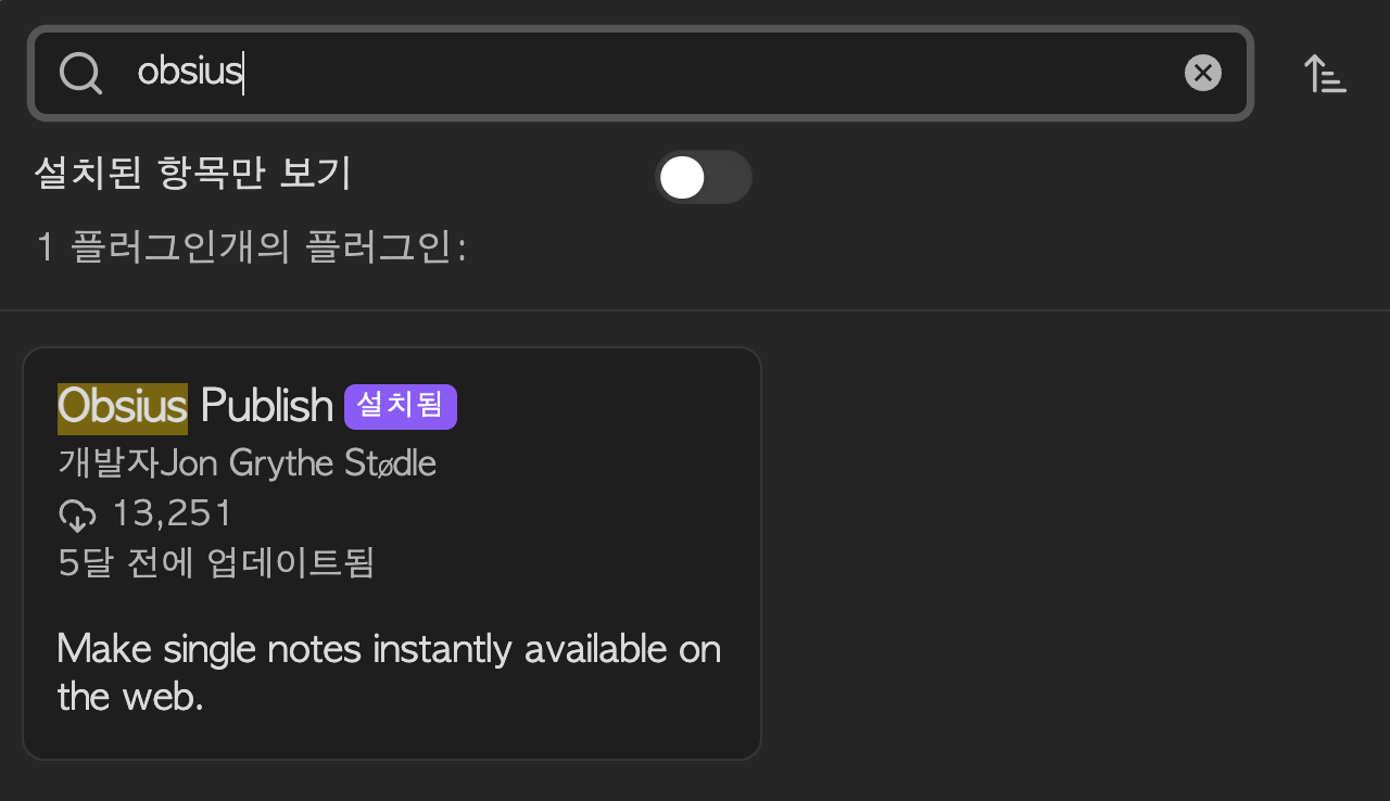 설정 > 커뮤니티 플러그인 > 탐색 > Obsius Publish 검색