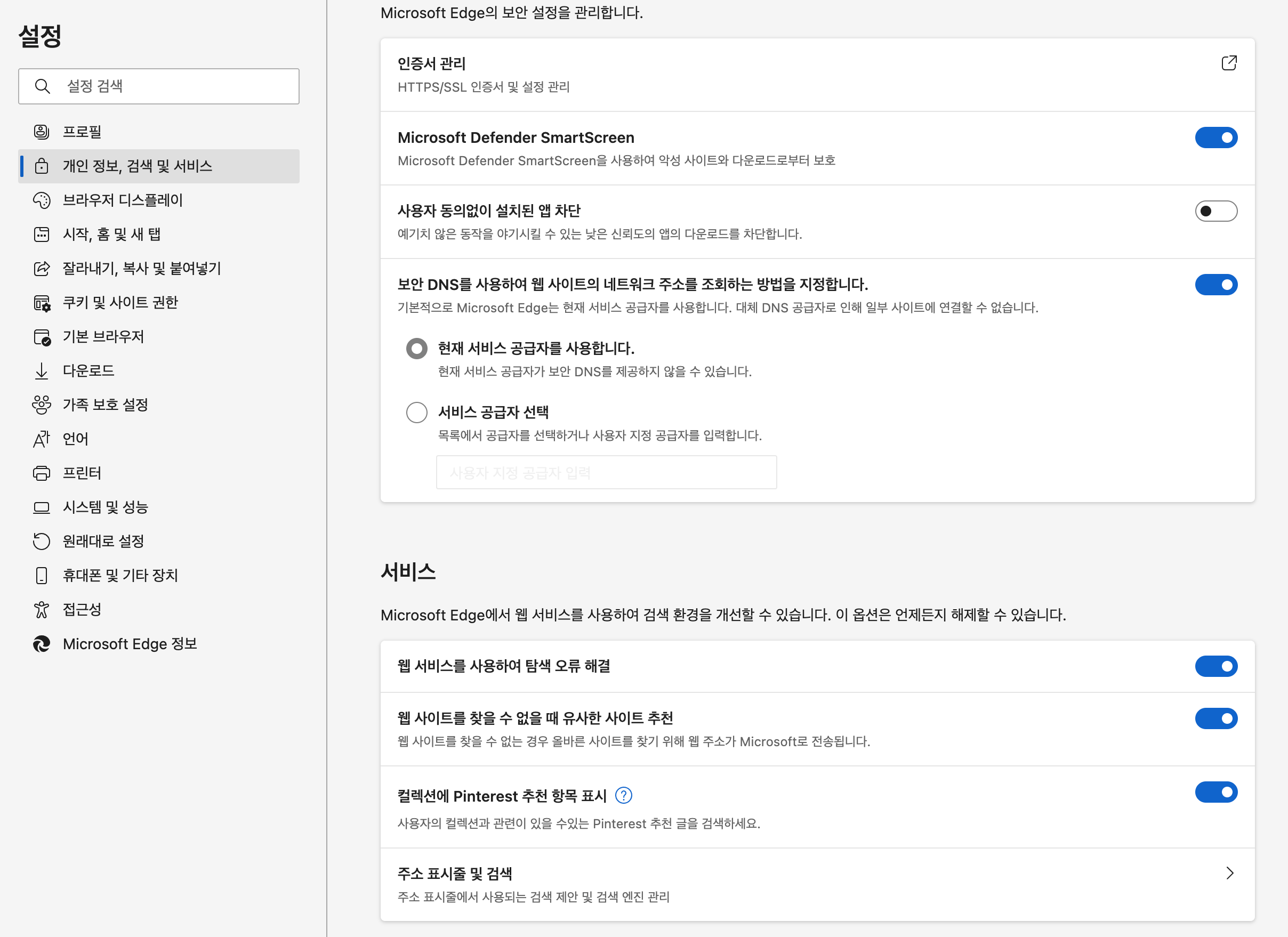 2. 개인정보, 검색 및 서비스 클릭 (가장 아래로 스크롤)