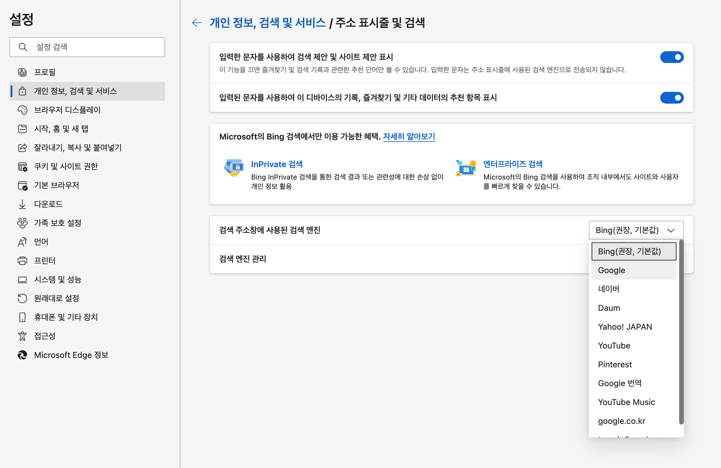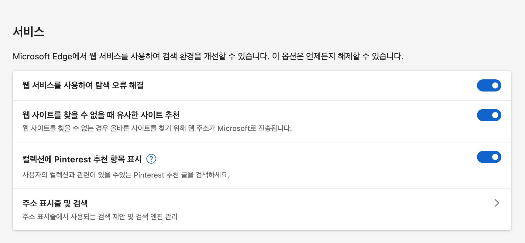 3. 맨 밑으로 스크롤하면, 마지막 서비스 -> 주소 표시줄 및 검색 클릭